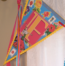 Magenta, turquoise and orange colors vibrate together on this playful banner. Flowers and fruit dance along side a guitarist and a folk dancer. Fill your space with this fiesta banner and welcome your guests to the fun! This matching banner can be purchased on bnute.etsy.com.